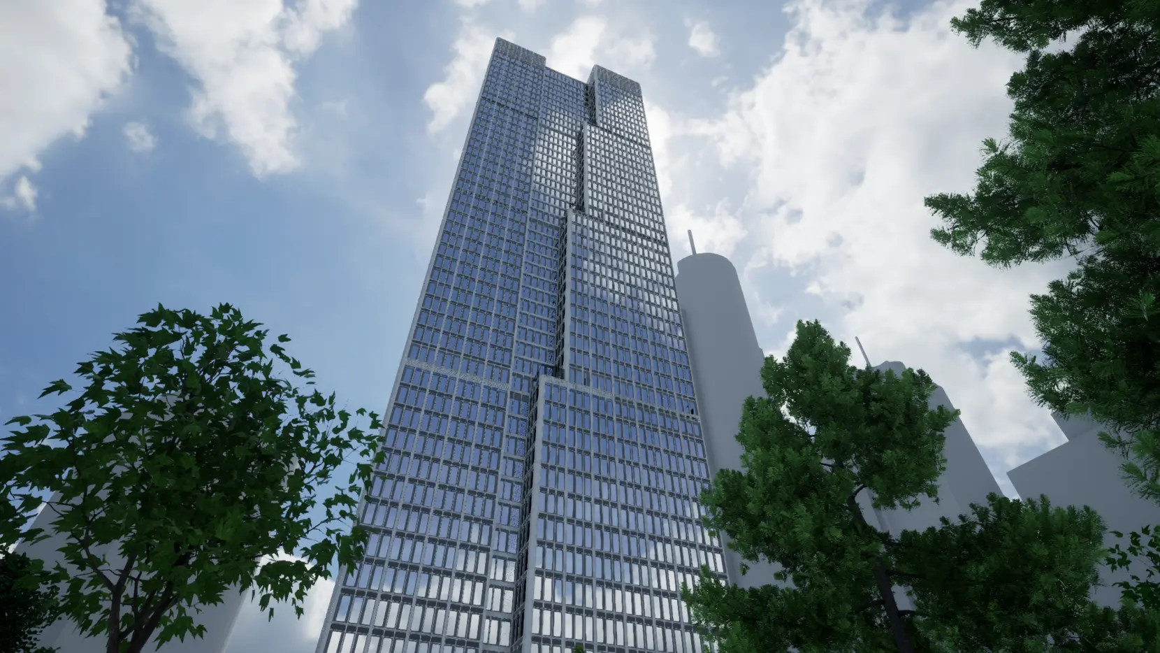 Darüber erstreckt sich der Turm, der optisch markant in zwei Teile geteilt ist und durch eine gläserne Fuge, die sich nach oben hin abgetreppt weitet, verbunden wird.