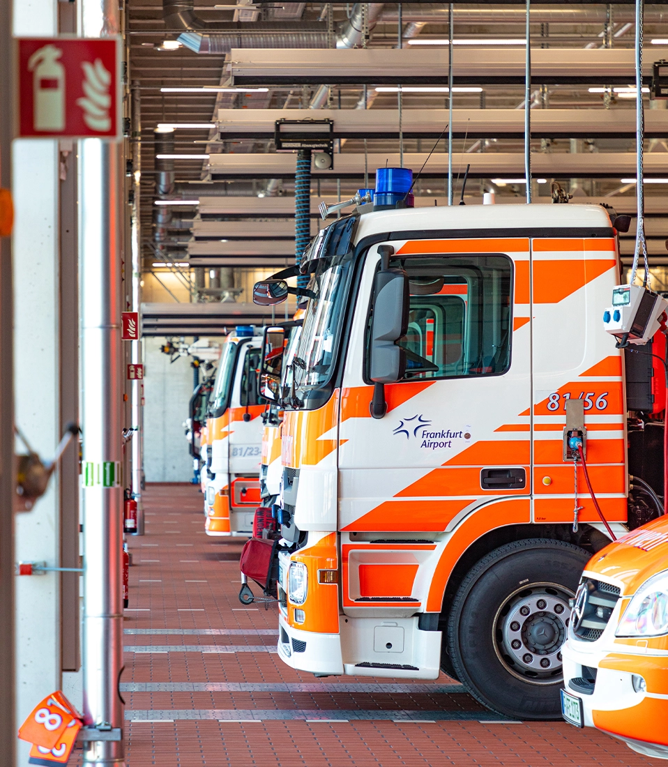 Einen wesentlichen Bestandteil der neugebauten Feuerwache 1 bilden die Fahrzeughallen, in denen die circa 51 Einsatzfahrzeuge des abwehrenden Flugzeugbrandschutzes und des Gebäudebrandschutzes untergebracht sind.