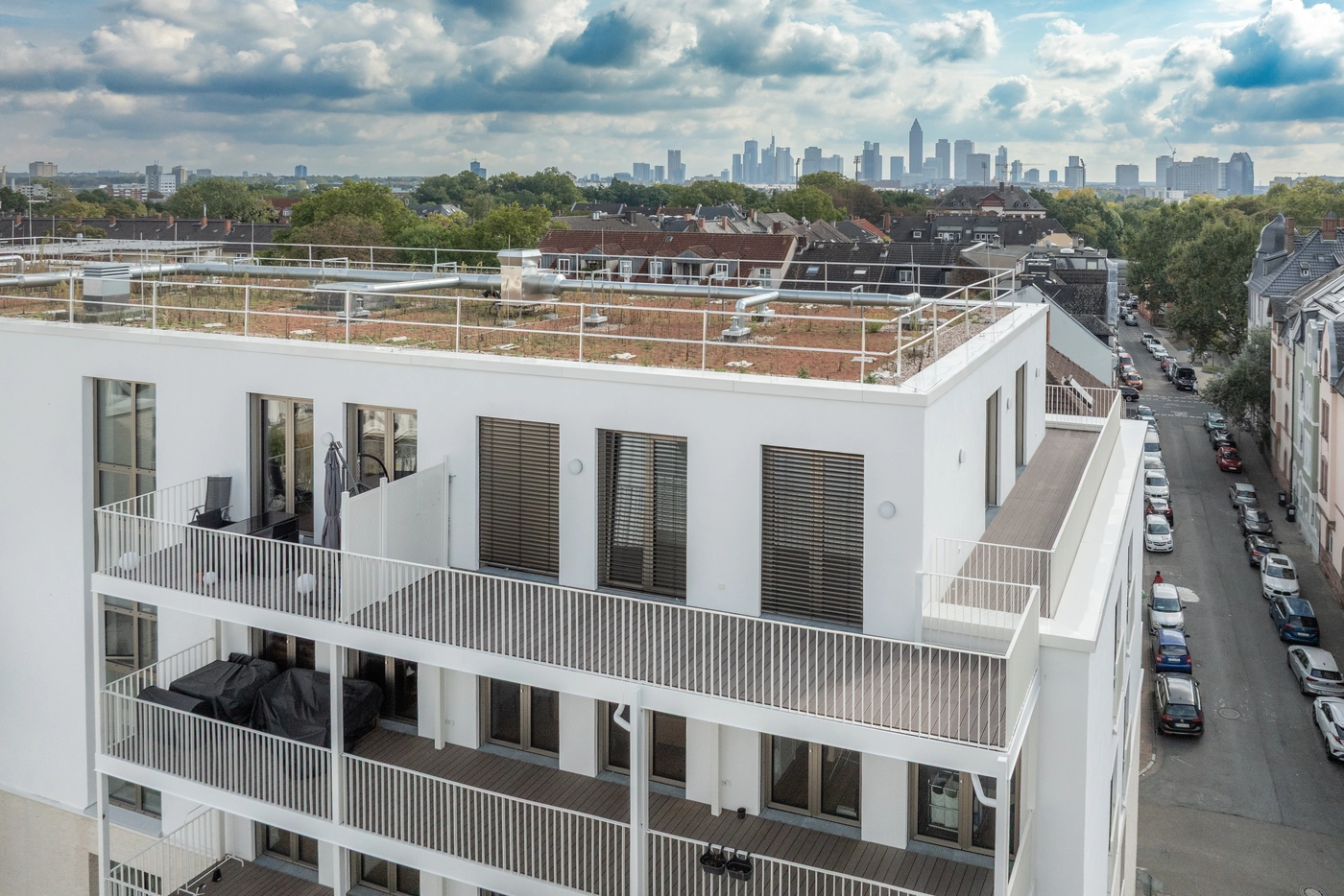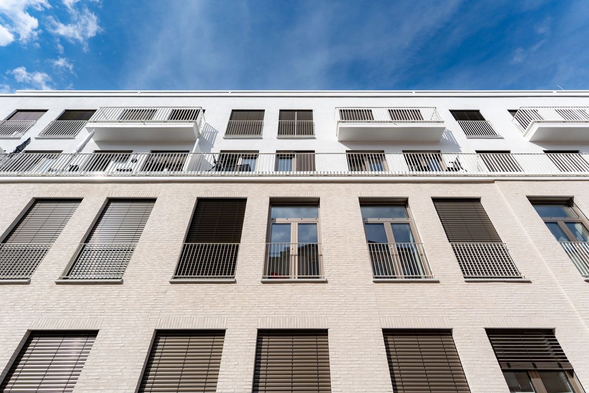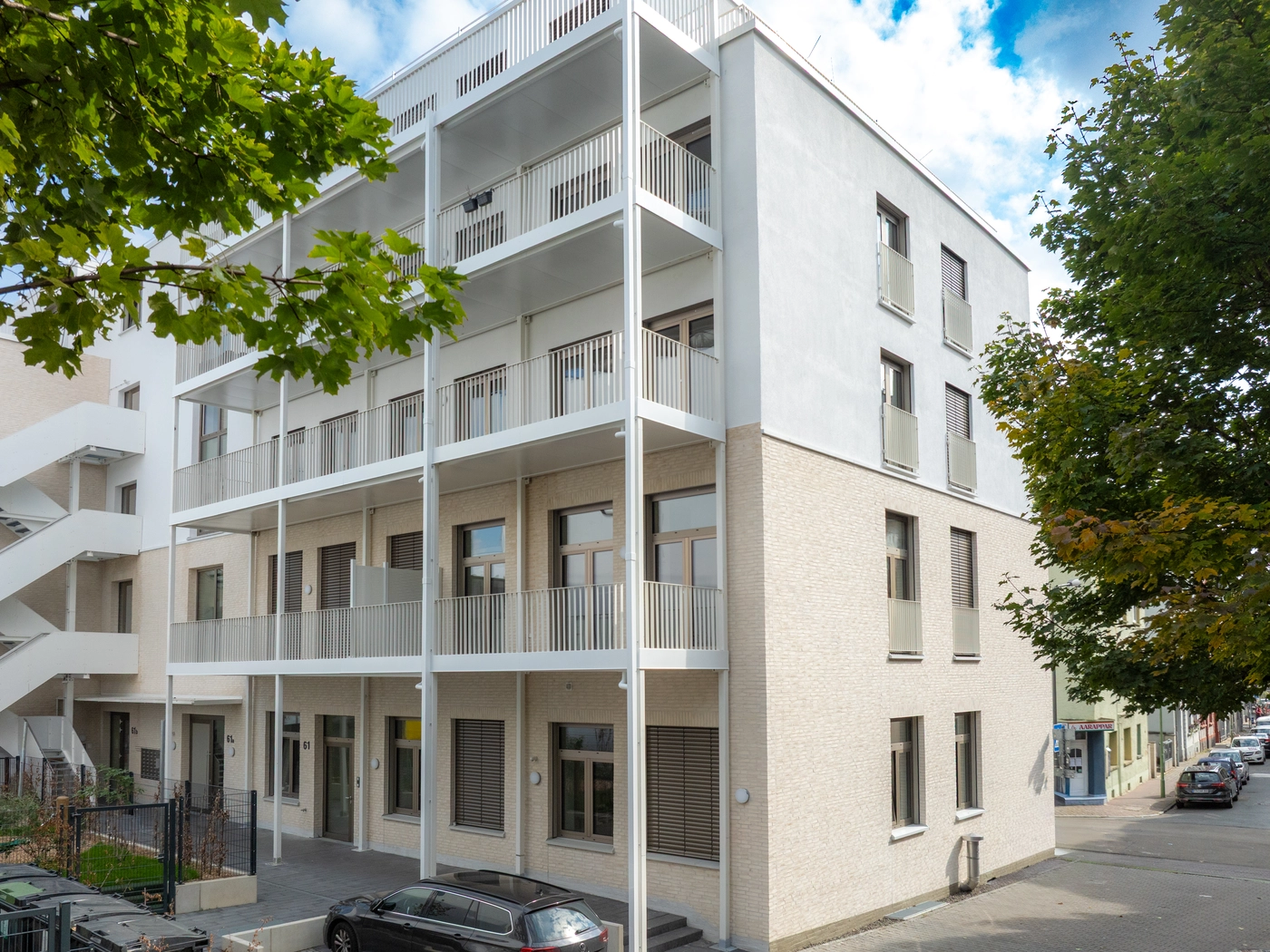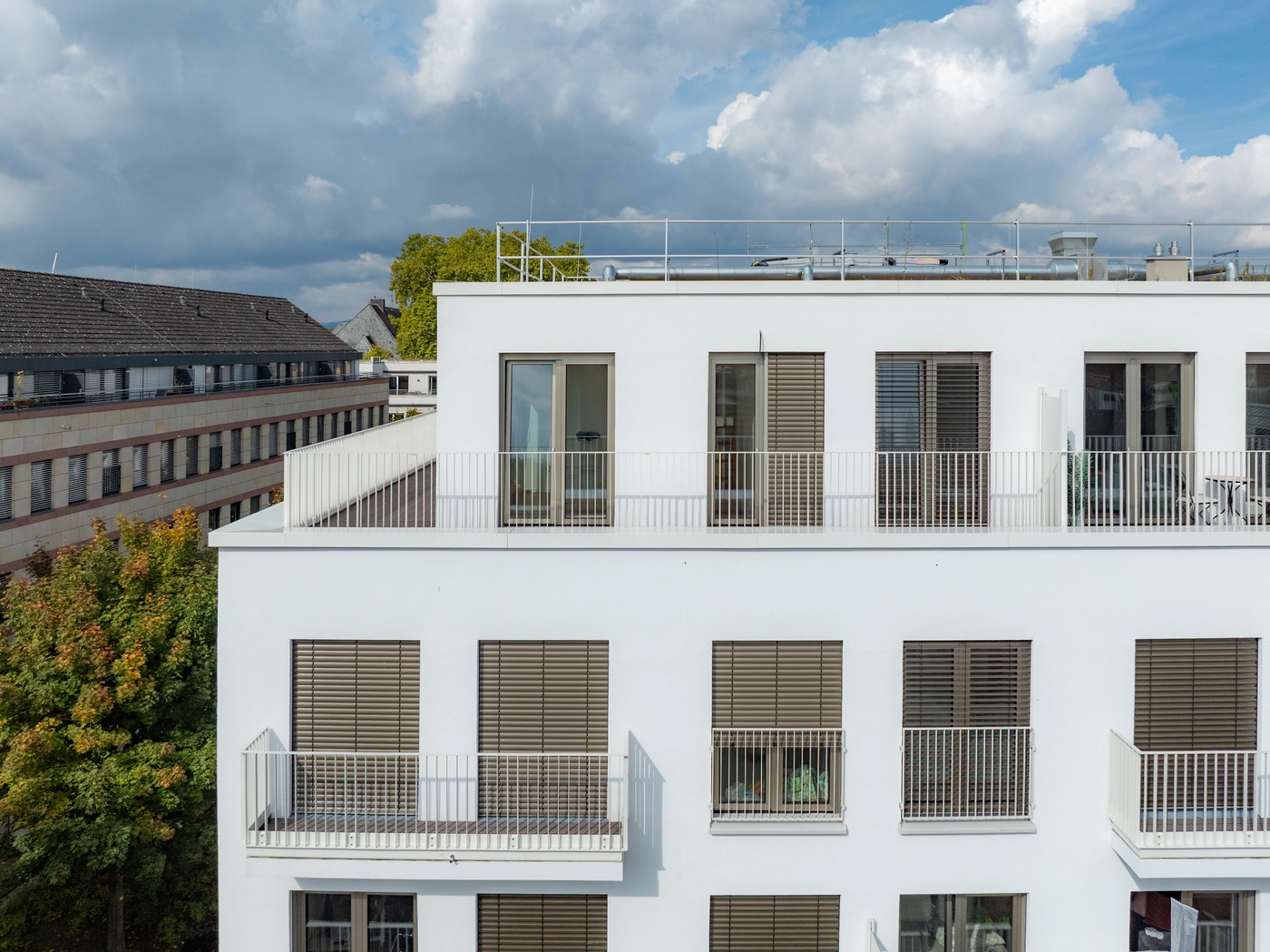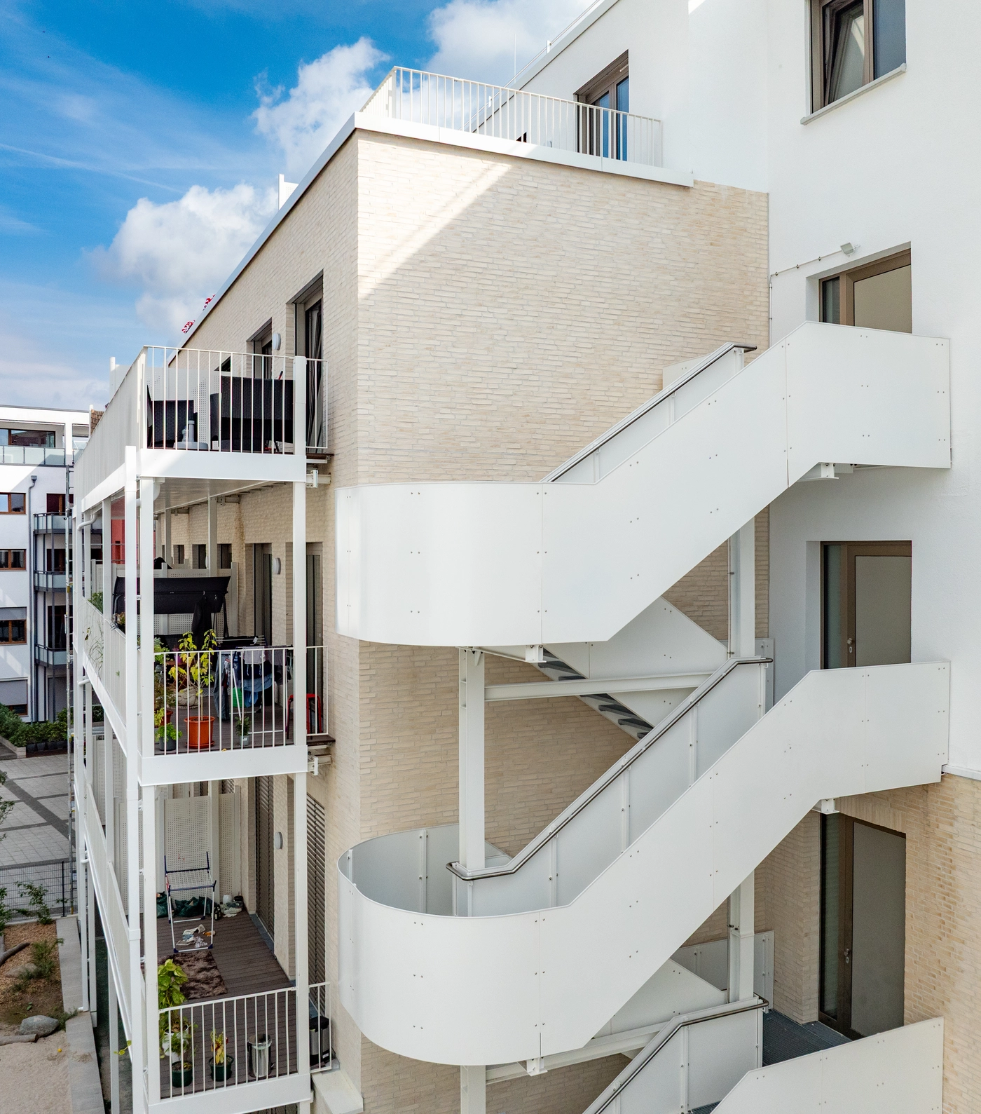 Das Gebäude wird um ein Vollgeschoss und ein zurückgesetztes Staffelgeschoss aufgestockt, wodurch 34 neue Wohneinheiten im 1. bis 4. OG entstehen. Im Erdgeschoss bleiben die gewerbliche Nutzung und eine KiTa mit zwei U-3-Gruppen erhalten. Die Umnutzung auf Wohnen entspricht dem Effizienzhaus-Standard 55. Die neuen Wohnungen sind über das bestehende Treppenhaus und einen Aufzug erreichbar. Hofseitig erhalten die Wohnungen Balkone, und einige im 3. und 4. OG haben zusätzlich Dachterrassen. Die Fassadengestaltung wechselt von hellen Klinkerriemchen zu weißem Putz und hebt sich durch ein umlaufendes Gebäudefries ab. Die weiße Gesamterscheinung wird durch filigrane weiße Stahlbalkone und Geländer sowie eine weiße Außentreppe verstärkt.