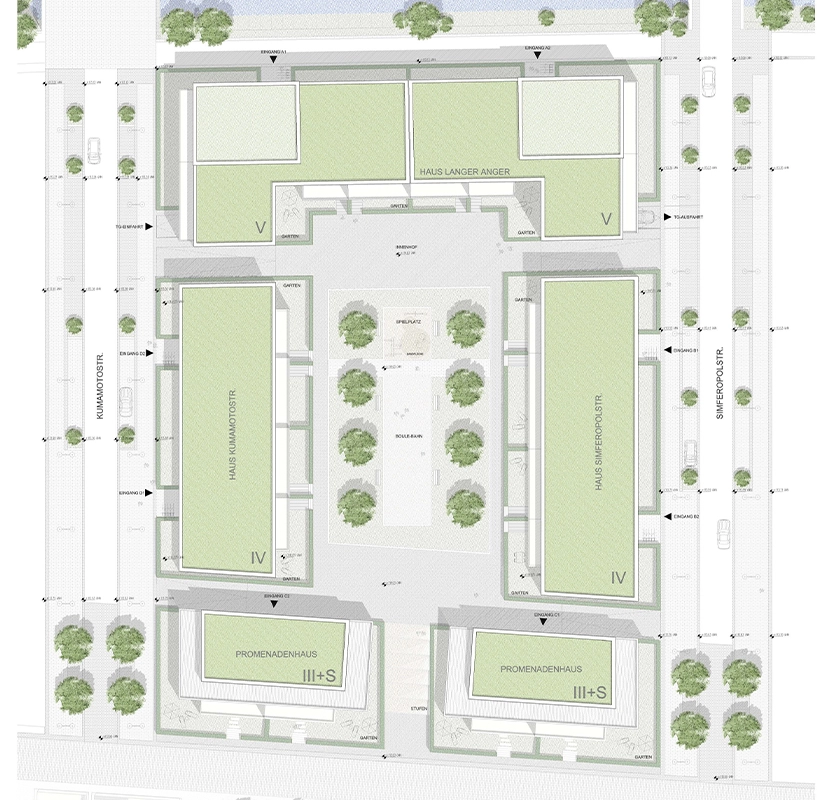 Die Realteilung erfolgt in der Blockmitte (bei gemeinsamer Tiefgarage). Die Bauweise soll dem nachhaltigen Anspruch gerecht werden, den der Leitfaden „Qualitätsbausteine-